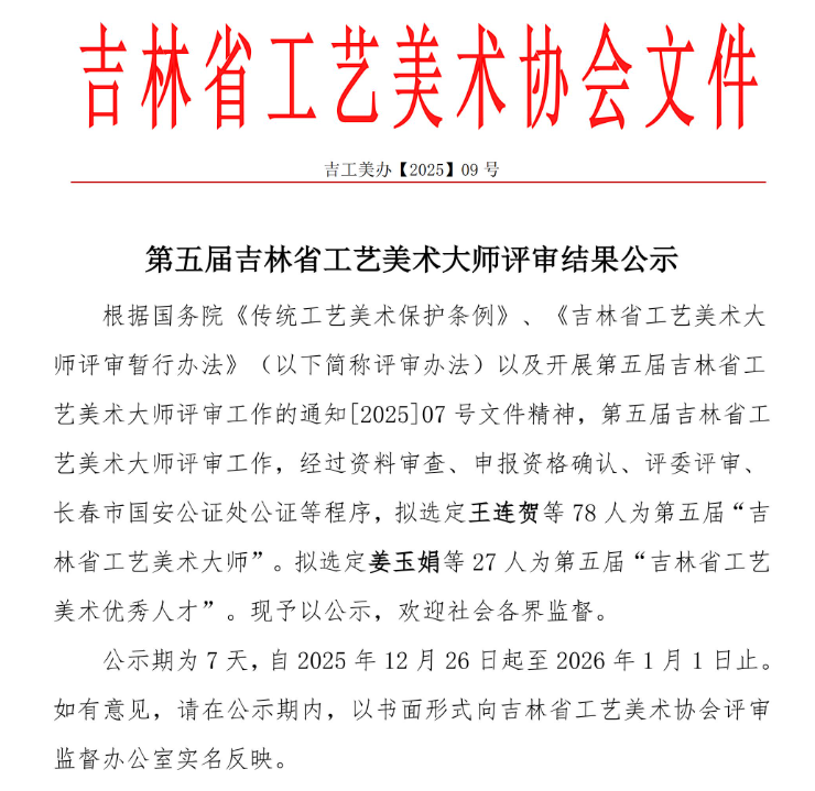 “吉林省工艺美术大师”是我省授予长期从事工艺美术事业工作者的重要荣誉称号。该评选在推动我省传统工艺美术传承与创新、促进工艺美术行业高质量可持续发展、弘扬吉林优秀传统文化、表彰德艺双馨、业绩突出的工艺美术专业人才等方面发挥着重要作用。